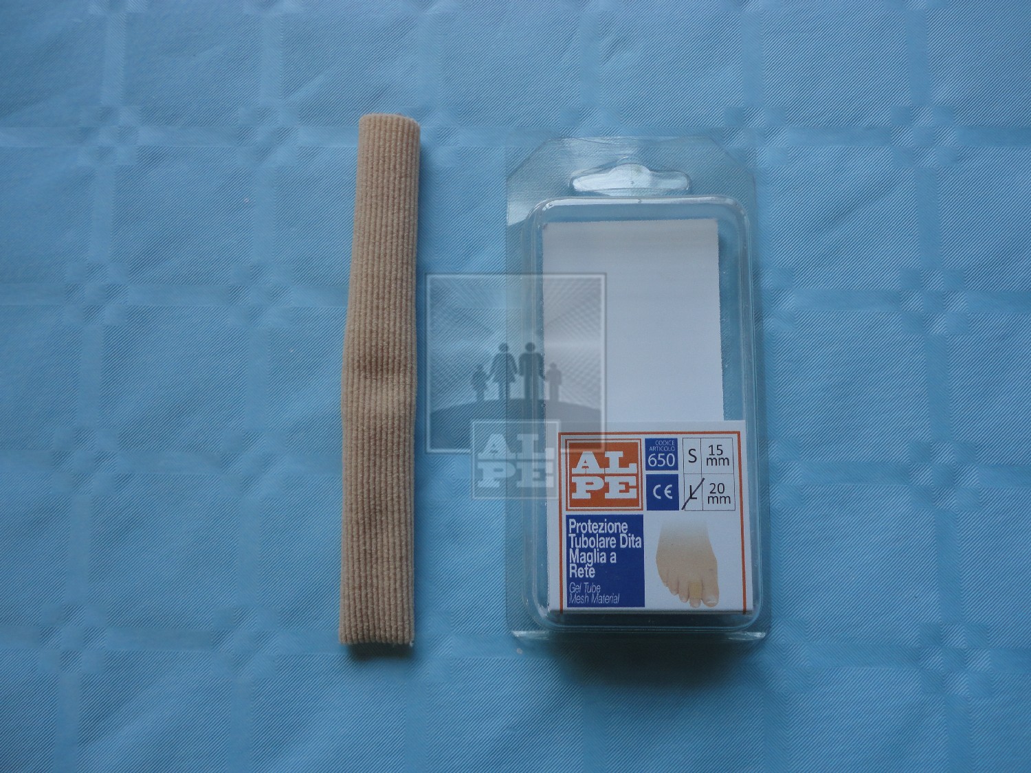 Protection in polymeric gel for foot toes. It consists in an elasticized mesh material outside and in polymeric gel inside. Tube length cm.15, can be cut to the desired length